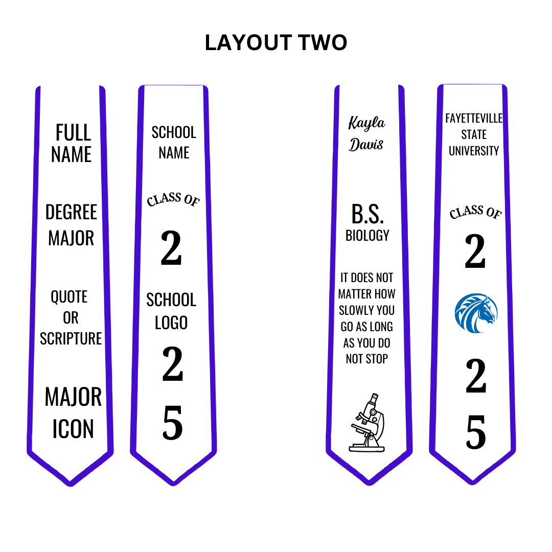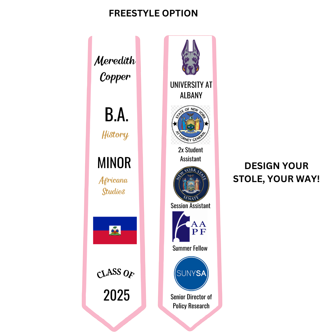 All graduation stoles are custom-designed with intention and care. To begin, please use the customization text box to provide all details for your stole, including: